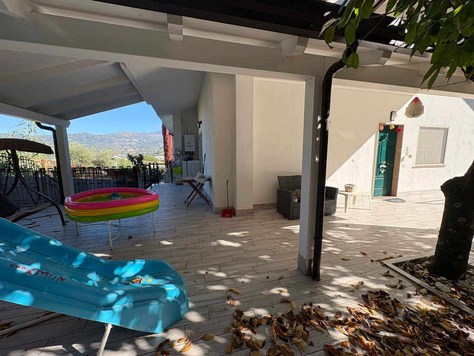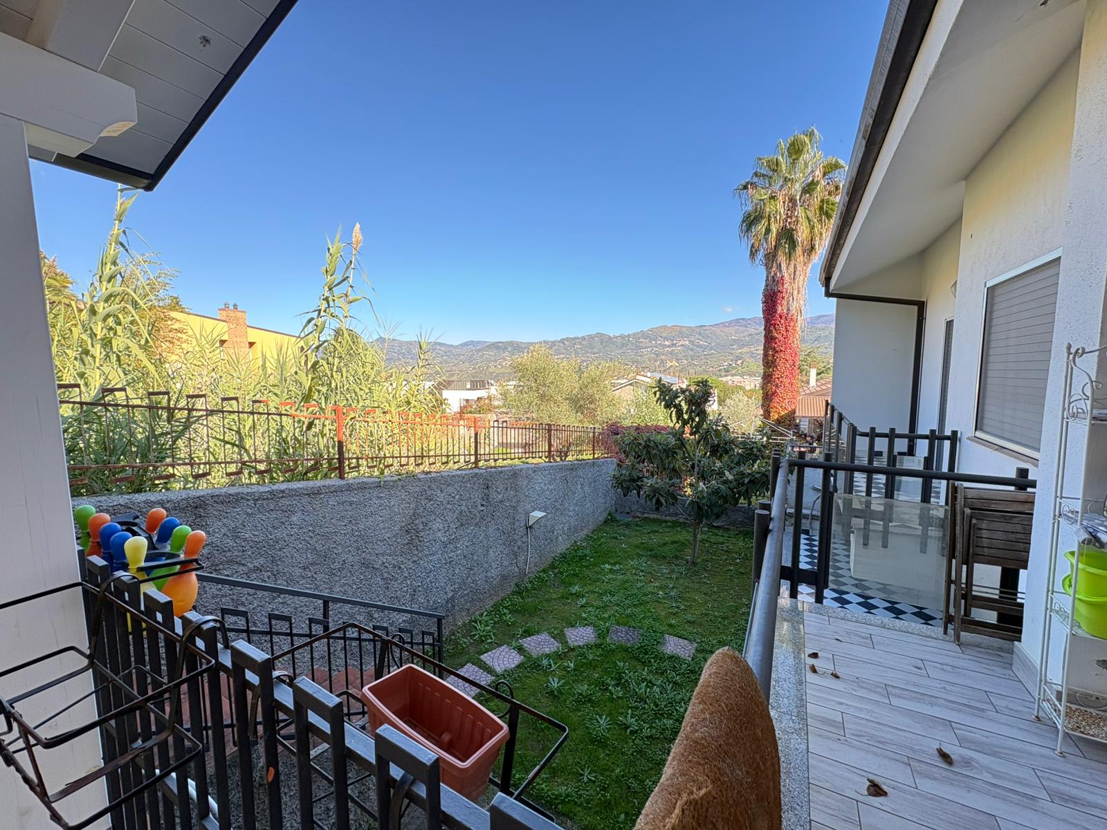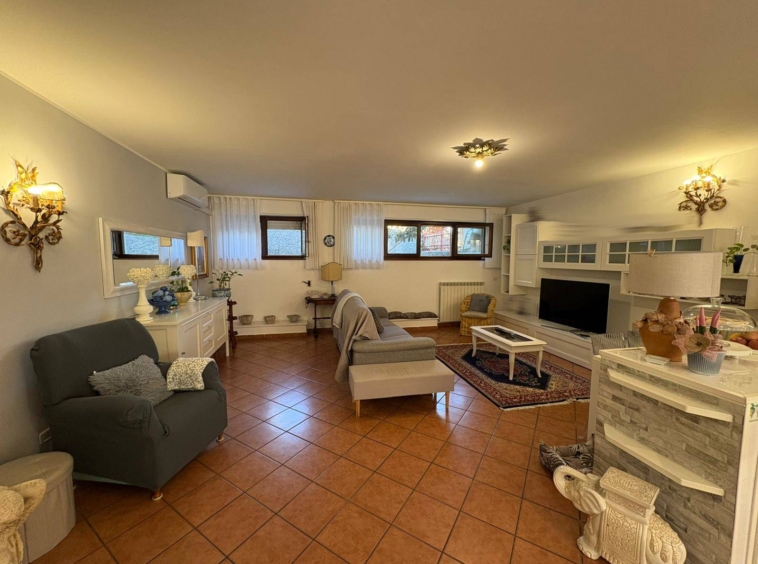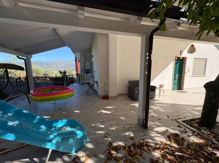 La villa dispone di un giardino di circa 400 mq, in gran parte pavimentato ma con aree dedicate a verde, alberi da frutto e zone ornamentali, ideale per vivere comodamente gli spazi esterni tutto l’anno.