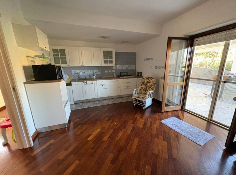 Piano Rialzato: ingresso, luminoso salone con affaccio diretto sul giardino, cucina con accesso ad un elegante portico coperto in legno lamellare bianco, perfetto per pranzi e cene all’aperto; due camere da letto (di cui una con bagno privato) e ulteriore bagno.